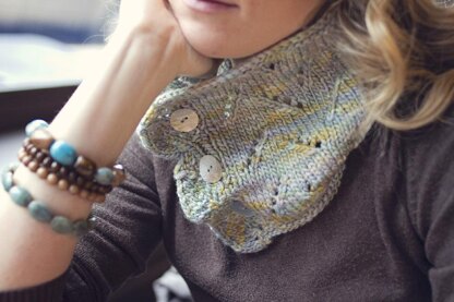 The Spring Awakening Cowl is a cozy spring accessory. It is knit straight, width-wise on circular needles, with a garter stitch edge on the top and bottom edges of the cowl. The body of the cowl is knit in a “leaves of grass” stitch pattern with a leaf motif on one side edge. A button hole (for mother of pearl shell buttons) sits at the bottom of each of the stems on the leaf motif edge.