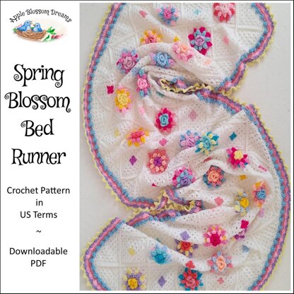 Crochet this colorful Spring Blossom Bed Runner using seven skeins of 100 gm (295 m) DK weight yarn in white and less than one skein of up to 15 additional colors (the additional colors are great for busting a yarn stash). Please note that any yarn can be used but may change the finished size. This pattern is based on the original 'Blush Blossom Baby Blanket' pattern also listed in this shop.