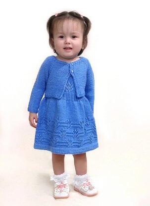 The coordinating bolero is worked seamlessly from the top down, beginning with a raglan increase yoke. Stitches are put on hold for the sleeves while the body is completed. The sleeves are then worked in the round.