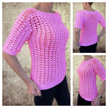 When looking at this , easy to make sweater, it makes you happy and it gives you that Spring feeling. Made sideways so you can adjust the sizes easily. Any color will be fantastic, from happy pink to classy black and everything in between. Cotton or acrylic, they will both give you that nice bubbly look.