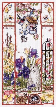 By Nancy Rossi. Spring Cat Sampler. An adorable white and gray cat sits peacefully among the birds, butterflies and other critters. This scene is alive with beautiful color and gorgeous flowers. All of the signs of spring in one window.