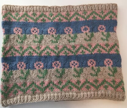 This snood is knitted in the round. The fair isle pattern has a colour coded chart to follow making this a simple project for advanced and beginner knitters using fair isle techniques. Simply choose 4 colours in a DK Yarn and away you go.