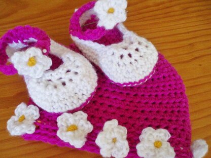 Spring flowers baby shoes and hat is a crochet pattern. The flowers are worked in the round on the hat and the shoes have high ankle straps. The pattern is written for 6 to 12 month babes, but the use of fingering yarn and size 4 hook, will make it suitable for smaller babies.
