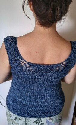 This is a pattern for a low scoopneck tank top with a bit of lace and wide-set straps. It is worked mainly in the round from the top down. There is an option for shaping at the waist and designed to be somewhat personal and you are encouraged to try your garment on as you work.