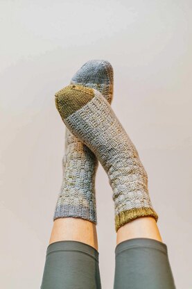 Knit cuff-down with heel flaps and a staggered broken rib pattern. Right and left socks are identical except for reversed colors; they could easily be worked at the same time. Sized to make a pair for the entire family!