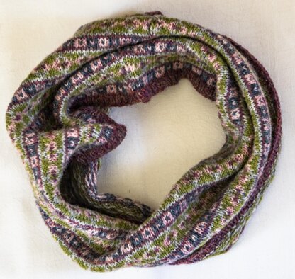 This is a simple fair isle pattern that is repeated as you work the pattern. It is a single loop snood but could be adapted to make it larger.You need 5 x 25g balls of Scottish DK. The kit is also available from my website.