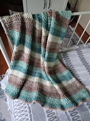 The solid and stripe shades in Caron Cotton Cakes coordinate perfectly for your Spring/Summer. This soft, versatile yarn with its unique cotton blend and larger ball size is ideal for this light blanket. The blanket is a simple rectangle worked from bottom to top, in rows of HDC and ch stitches in back loop only. Simple construction makes this a very meditative stitching project. To finish, do not fasten off, work a SC border around the perimeter of the blanket. Cut yarn and fasten off.