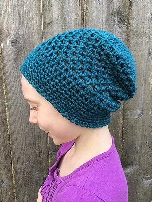 Worked with a larger than usual hook and open mesh pattern, this lightweight slouchy hat is perfect for the warm weather seasons. The length is adjustable for just the right amount of slouch, and the continuous spiral construction results in a seamless look. Only a few types of stitches are used, making this a good pattern for a beginner, as well as a quick and satisfying project for more advanced crafters.