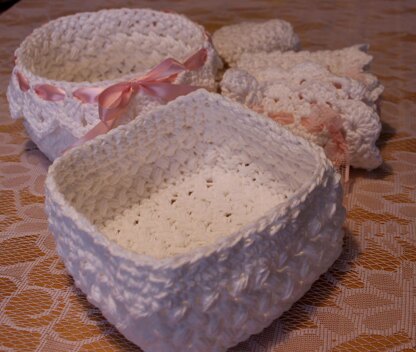 Oh this one is so sweet! A square basket, using the cluster stitch, and a small row of beading at the top for you to add a sweet bit of ribbon or lace. A Cluster basket with a precious drop over lace edge, and you can add lace or ribbon. This helps to complete the “Touch of Downton Spa Set”
