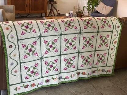 This is my very 1st design. It uses DK yarn, made of strips and squares. It uses changing and carrying colors, crochet appliqués and possible new stitches to create a challenging Afghan for experienced crocheters.