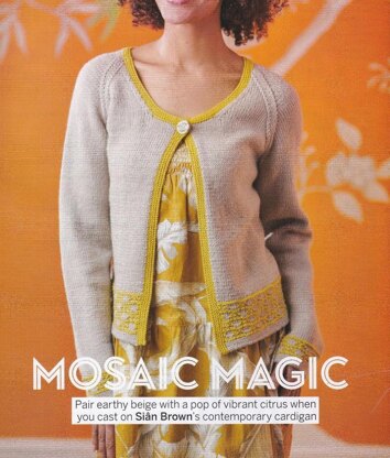 This is a pattern for a mosaic border cardigan, originally published in Simply Knitting. It is in stocking stitch with a squares mosaic slip stitch border on the body and sleeves. It has raglan sleeves, garter stitch edges and one button. The body is knitted in one piece. Photos Simply Knitting.