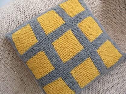 This is a pattern for Squares Cushion Cover. It is in a chunky yarn which knits up quickly. The squares are knitted in a simple intarsia, fine for someone who has just learned the technique. The back is in stocking stitch, with moss stitch edges.
