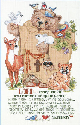 Designed by: Linda Gillum. Friendly woodland animals surround a gentle St Francis Bear. The prayer reads: “ Lord, make me an instrument of your peace. Where there is hatred, let me sow love, where there is injury, pardon; where there is doubt, faith; where there is darkness, light and where there is sadness, joy.”\n