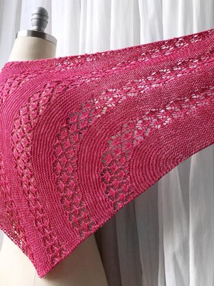 Just as a stage whisper is intended to be heard, this light and airy shawl will speak volumes. Its curved bands of lace and garter stitch are a visual interpretation of sound waves carried out over an audience. This pattern features an unusual construction, large swaths of relaxing garter stitch, and an easily memorized lace pattern with both written and charted instructions provided.