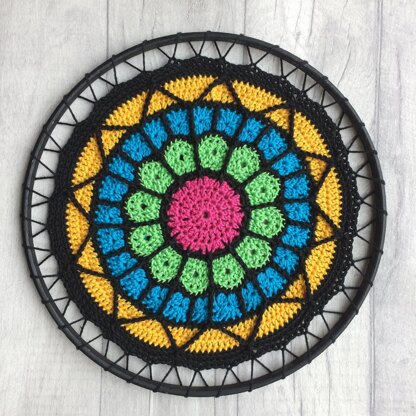 This colourful mandala pattern is intermediate in level. It uses a variety of clusters, shells, and front post stitches to create a stained glass effect. The magic ring, back post stitches, standing starts and invisible joins are also used. Written instructions are included for all atypical stitches. Written instructions and photos for the various steps of the pattern are included as well as a detailed crochet chart. This pattern is written in UK crochet terms.