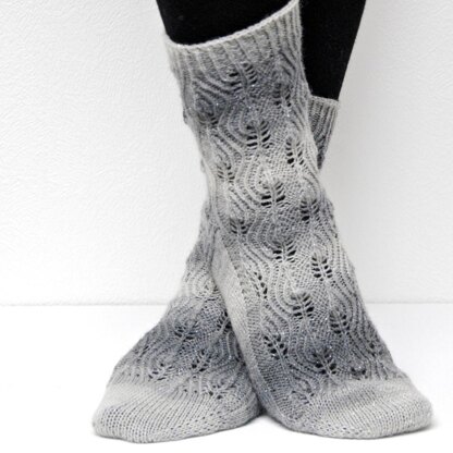 And now you can step into his socks. Navigating the mycelial network seems impossible at first but quickly gets intuitive as you travel deeper into space. These socks are knit from the toe up in the round in an undulating twisted-stitch and lace pattern. The socks feature a gusset-and-flap heel construction and a twisted-stitch heel flap. The stitch pattern is foot hugging, giving a comfortable fit on a wide range of foot sizes. Right and left socks are worked as mirror images of each other.