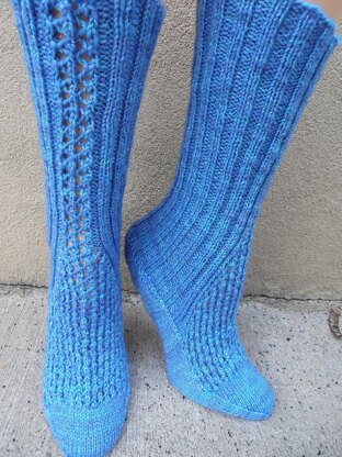 A ribbed sock with a lace rib detail down the leg which opens up to form a lacy gusset. The sock has a flap and gusset heel with a twist. Gusset increases are created on the top of the foot. The heel is turned and worked back and forth along the sole, decreasing off stitches.