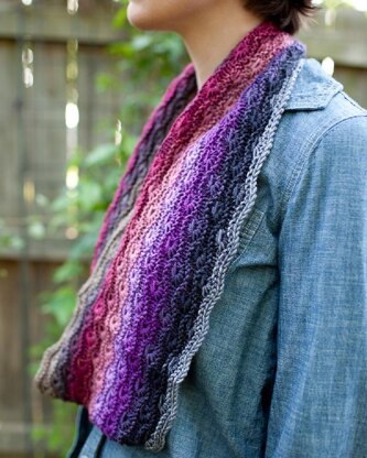 Starburst is a worsted weight, textured cowl featuring a unique cluster stitch that looks interesting on both sides and can be knit two different ways. Showcase a graduated stripe yarn such as Twisted Fiber Art Yummy (Version A), or have fun playing with alternated solid colors for a wavy striped effect (Version B). A looser gauge is used to produce a more open and drapey fabric. This pattern is for the intermediate to advanced knitter; written instructions are used.