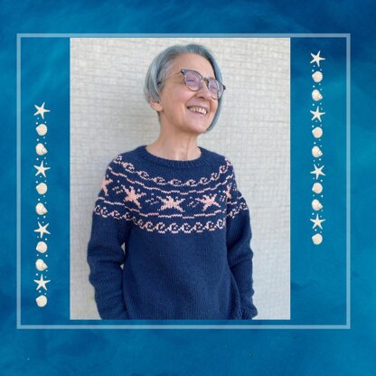 This jumper comes in eight different sizes. It is a top-down, circular yoke featuring stranded colorwork. The colorwork chart is read from right to left, bottom to top.