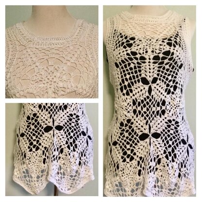 A seamless lace crochet motif pattern for a beautiful sleeveless tunic top. The bottom hem has a pretty scallop trim with decorative edging around the neck and armholes. Crochets relatively quickly using repeated motifs.