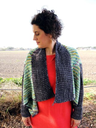 Notes about construction: Each garment is started with the Main Body, knit sideways using squishy garter stitch stripes. Afterthought sleeves are added simultaneously, then the collar stitches are picked up from a simple selvedge. The sleeves or arm openings are added last so that you can try it on as you go!