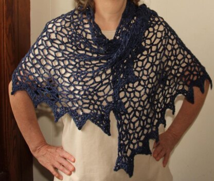 Perfect to wear on a cool summer evening, this shawl uses a single skein of fingering weight yarn and a large hook to create an exploded lace shawl with beautiful drape, It is lovely made with a sparkle yarn such as Dream in Color Starry or Red Heart Stardust.