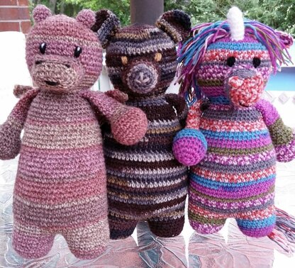 However, my friend Theresa loves to play around with different yarns, and has graciously given us several examples of what these toys will look like using a variety of other yarns we might also have floating around our stashes! All of her examples are included in the pattern.