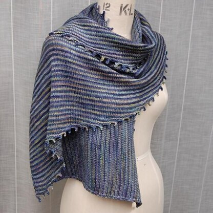 A completely reversible shawl with a curious construction. It’s easy to wear and easy to make. It’s perfect for when you’re going to Stay Awhile and need more than a little Knit Night project. This beautiful design is ideal for showing off two hand-dyed yarns in gorgeous stripes. It looks equally wonderful made in just one favourite hand-dyed yarn. You can go to town on your yarn choice; the simply elegant pattern will show it off well. It’s also a flexible pattern: any yarn can be used in any gauge, from a heavy laceweight through fingering, right up to worsted or aran. If you use a lightweight yarn, optional beads can be added to the picot edging, highlighting the different colours you’ve chosen.