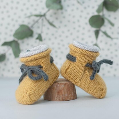 The Tom baby boot knits up like a sock and stays on. It's an easy knit and a great design to play with colour and yarn. They're super cute and part of my stay-on shoe range. Your baby can kick, crawl, pull and they'll still have warm little toes! You can choose to knit with the ties or include an elasticated ankle band to help keep them on, while still being flexible and comfy.