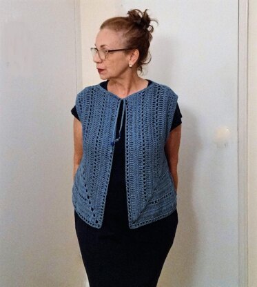 The Steccato Cardi Vest can be styled in many ways. The oversized fit makes it easy to wear over tops with or without sleeves. It is worked around the armhole from shoulder to shoulder in 2 pieces. The yarn used is a natural fiber, light weight 51% cotton, 49% rayon from bamboo DK, resulting in a soft drape. The pattern consists of 6 sizes, as well as photos, a schematic, and a chart. Sizes: XS, S, M, L, XL, 2XL. Yarn Weight: DK. Skill Level: Intermediate. Crochet Hook: US G