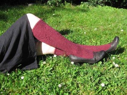 The knee-high sock is worked toe up and has a adjustable calf-sizing, shown with a 13.5 inches calfcircumstance.