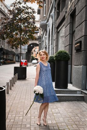 “Stezhka” dress is worked from the bottom up in one piece in the round. At armhole level, work is divided into Front and Back, which are finished separately, shoulder seams are joined using the three-needle bind-off method.
