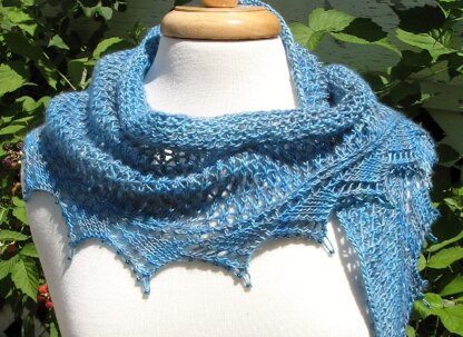 Still Waters begins with a beaded lace edging, worked sideways. Stitches are picked up along the long edge, and the short-row lace body is worked up from there. Lace patterns are provided in both charted and written format. Sample used 280 yards.