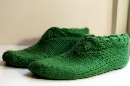 These cozy slippers are a combination of clever construction, pretty cables, and simple shaping. Bulky yarn makes this the perfect pattern for a last-minute holiday gift, with no more finishing than a grafted toe.