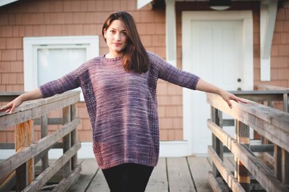 Drop shoulder construction is taken to the extreme in this oversized, flowing pullover. Skinny three-quarter length sleeves give a contemporary look. Vertical bands of lace at each edge of the front and back add lightness and interest to the garment as well as a long and lean look to the wearer.