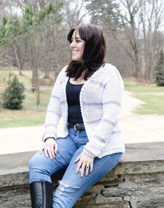 This pattern has been pattern tested! Pattern has been graded using CYC Standard Measurements. Sizes include XS (S, M, L, XL) (2X, 3X, 4X, 5X) to fit bust sizes 32 (36, 40, 44, 48) (52, 56, 60, 64) in. You will need: - Color A (white): 4 (5, 5, 6, 6) (7, 8, 9, 9) balls of Lion Brand Truboo in White for sizes XS (S, M, L, XL) (2X, 3X, 4X, 5X) or 910 (1013, 1146, 1273, 1444) (1610, 1781, 1998, 2106) yards of similar DK yarn that matches gauge. - Color B (lilac): 1 (1, 1, 1, 1) (2, 2, 2, 2) balls of Lion Brand Truboo in Lilac for sizes XS (S, M, L, XL) (2X, 3X, 4X, 5X) or 127 (157, 169, 183, 223) (251, 268, 285, 299) yards of similar DK yarn that matches gauge. *Model is wearing the cardigan with 2 inches of positive ease.