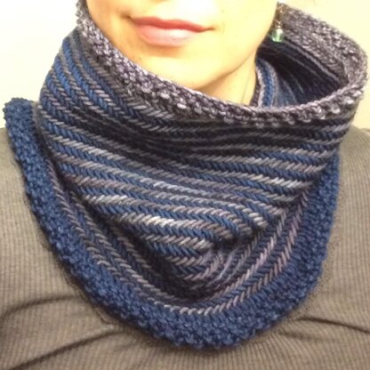 This cozy cowl is knit in herringbone and seed stitch using two alternating colors. Because of herringbone stitches being quite thick the cowl is sturdy and stands up nicely, warming your neck.