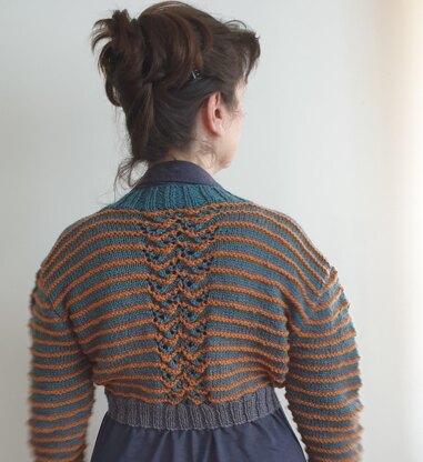 The use of a single reverse st st row in a contrast colour, gives the cardi an interesting optical colour effect This is combined with a lace-stitch panel at the centre back and on the sleeves adding to the unique texture of this garment.