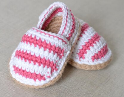 CROCHET PATTERN for cute little Stripy Espadrille Shoes for Baby. These are nice, simple shoes for boys or girls - have fun choosing some nice bright colors in soft cotton dk yarn.