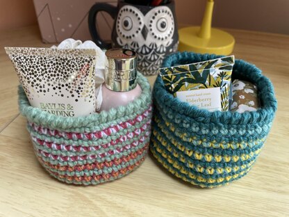 This stylish pattern makes a lovely little basket for filling with a few small gifts for a friend's birthday, or to store little bits and pieces at home or on your desk at work. A good project for making use of any chunky and DK yarns remnants in your stash.