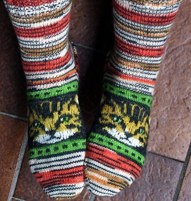 Sock pattern knitted toe up with heel flap. Stranded knitting for the cat, plain stockinette at heel and leg.