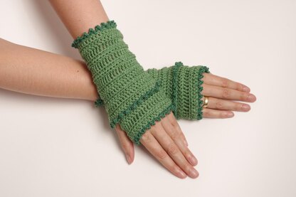 These fingerless gloves keep your hands warm while going on a walk to enjoy the early spring weather or while sipping hot tea at home in autumn. Working into just one loop of each stitch gives them some interesting texture without making them hard to crochet. The pattern comes with a picture tutorial on how to work picots.