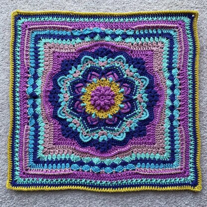 This square is designed to be a central focus for an afghan / blanket surrounded by other squares which meet the standard 12 inch worsted weight definitions. As such the final stitch count is 79 stitches per side (= 39 sts x 2 squares, + 1 st for the join).