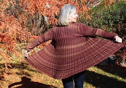This classic swing coat is knit in fingering weight yarn, and features graduated ribbing and seed stitch accents. The lightweight yarn allows the coat to be as light and airy as falling leaves.