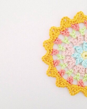 Make these bright and colorful sunny coasters with this easy to follow crochet pattern. There is a link to a clear tutorial in this pattern on how to change colour and how to make a magic ring. All my patterns are written in US terms.I used Phildar Coton 4 and a crochet hook size 3mm for this pattern. My coasters are 5 inch wide. The pattern contains my email address just in case you need help during the making of this pattern. Please don't hesitate to contact me if you need help, I'm happy to help if necessary.