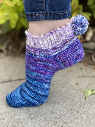 This is a fun summer sock to run around town in your sneakers, or to have on in your house when your feet get chilly. Have fun playing with color and add the optional pom pom for a little extra treat on your feet.