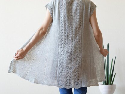 It is worked from the top down seamlessly. The fronts and back are first worked back and forth separately with short-row shoulder shaping. They are joined at the underarm, and the lower body is knitted in one piece to the hem in an A-line silhouette. Front and neck band is worked in garter st once the body is finished, and armhole edging is worked in the round in 1×1 rib.