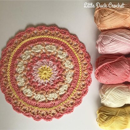 The finished mandala measures approximately 8" in diameter but if you do use different yarns and hook sizes, the size will vary.