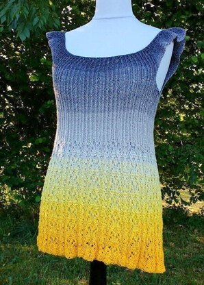This is a pattern for a bottom up tunic/dress/tank. It is intended to be worn with negative ease over the bust and has a lace and rib motif. The overall shape is A-line or trapeze and with straps forming a gentle flared edge.