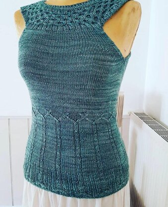Imagine yourself wandering in a meadow in high Summer, when the grass is high and bees are gathering nectar for honey. The long twisted stitches mirror the grasses and the honeycomb yoke the industry of the bees. The recommended yarn is silk sock, which is VERY stretchy. There is 4 inches of negative ease built into the sizing, so please choose accordingly.